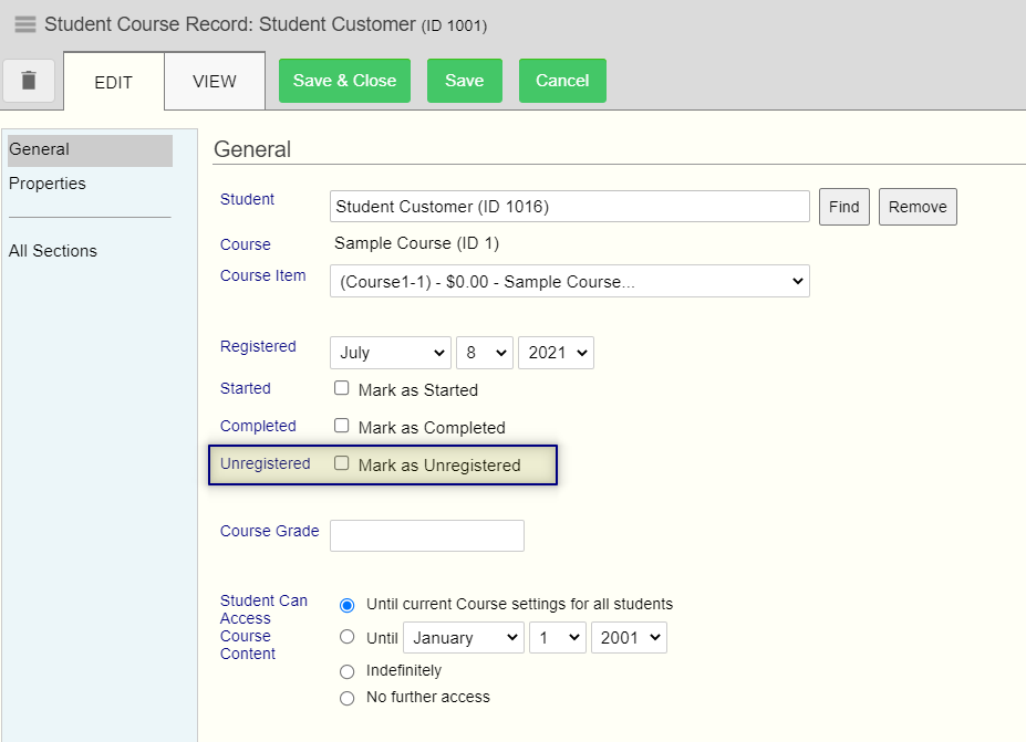 Location: Learning Management/Courses /Student Course Records/ Student Course Record Editor -> General Section